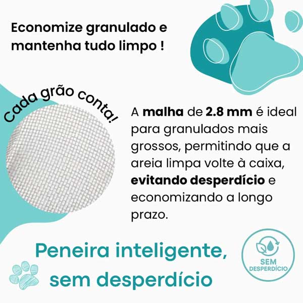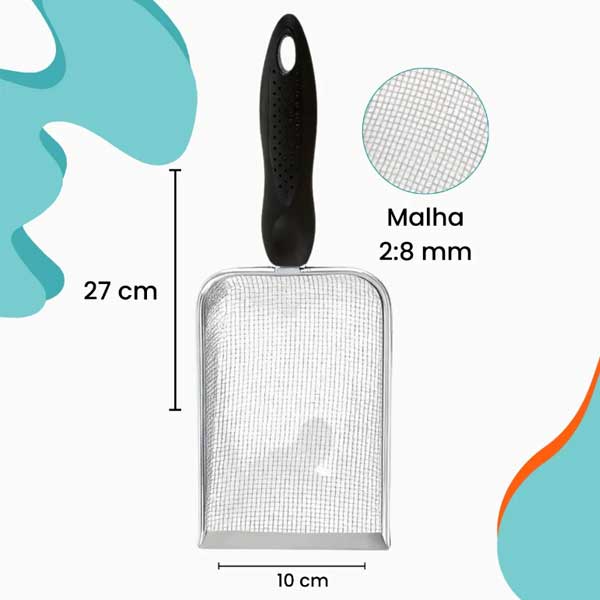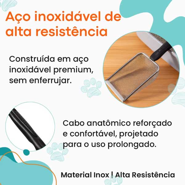 A malha fina e uniforme permite separar facilmente os resíduos, mantendo a areia limpa e evitando desperdício. O cabo anatômico oferece conforto e firmeza durante o uso, tornando o processo de limpeza mais rápido e sem esforço. Além disso, o material inox facilita a lavagem e impede o acúmulo de sujeira e odores — um simples enxágue e ela estará pronta para o próximo uso.